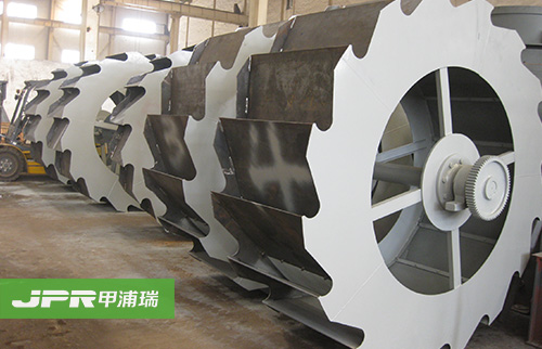 工作時,電機通過三角帶、減速機、齒輪減速后帶動葉輪緩慢轉(zhuǎn)動,砂石有給料槽進入洗槽中,在葉輪的帶動下翻滾,并互相研磨,除去覆蓋砂石表面的雜質(zhì), 同時破壞包覆砂粒的水汽層,以利于脫水;同時加水,形成強大水流,及時將雜質(zhì)及比重小的異物帶走,并從溢出口洗槽排出,完成清洗作用。干凈的砂石由葉片帶 走,后砂石從旋轉(zhuǎn)的葉輪倒入出料槽,完成砂石的清洗作用。