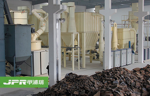物料經(jīng)顎式破碎機(jī)破碎后,由斗式提升機(jī)送至儲料倉,通過電磁振動給料機(jī)把物料均勻連續(xù)地送到主機(jī)進(jìn)行研磨,研磨后的粉末在鼓風(fēng)機(jī)的作用下吹向選粉機(jī)進(jìn)行分 選,分選后的細(xì)粉由管道送至儲料倉,后經(jīng)出料閥輸出即為成品。整套生產(chǎn)線工作過程中氣壓為負(fù),首先鼓風(fēng)機(jī)吹出的空氣伴隨著細(xì)粉經(jīng)管道進(jìn)入儲料倉上部的旋 風(fēng)收集器內(nèi),由回風(fēng)管道返回鼓風(fēng)機(jī),形成空氣循環(huán)利用。其次,集粉器下端裝有鎖粉器,其作用是將外界正壓氣體與集粉器負(fù)壓氣體隔離開,大大提高了產(chǎn)量。再 次,主機(jī)底部殘留的空氣和粉塵通過管道被送到布袋除塵器進(jìn)行過濾,粉塵等雜質(zhì)被布袋除塵器吸附,有效地保護(hù)了環(huán)境。